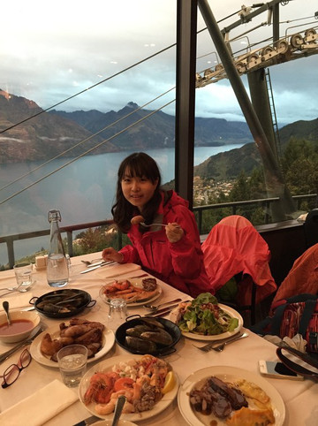 D7. 3/2一早Lake Wakatipu沿途拍摄,早餐后前往格林诺奇和天堂镇,下午QT闲逛,由于天气不佳,全天中雨,原定的极限项目被迫取消。6点乘坐Gondola上山顶,景观餐厅自助餐,美食非常丰盛,美景气势磅礴。