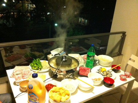 在房间阳台搭个桌子吃火锅+烧烤,看看路边的行人,吃完再来局dota,人生得意须尽欢。
