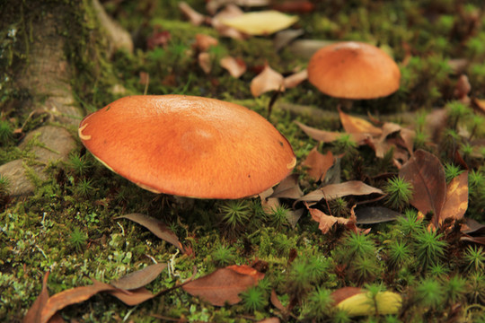 低头看落叶,发现地上还有小蘑菇,可爱吧