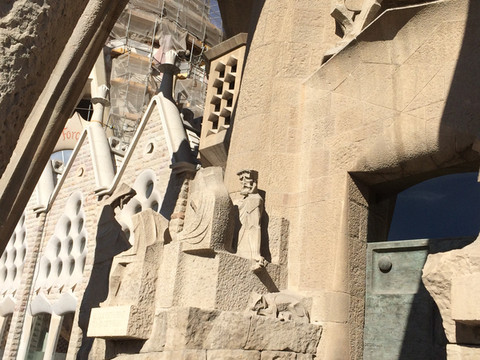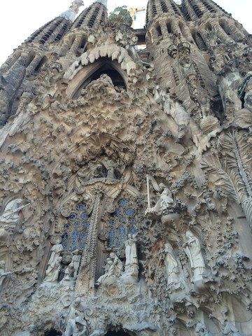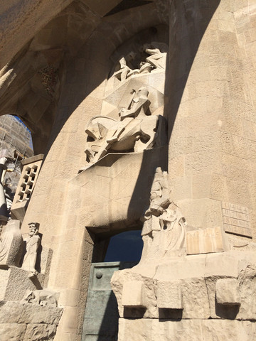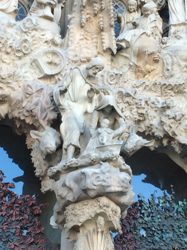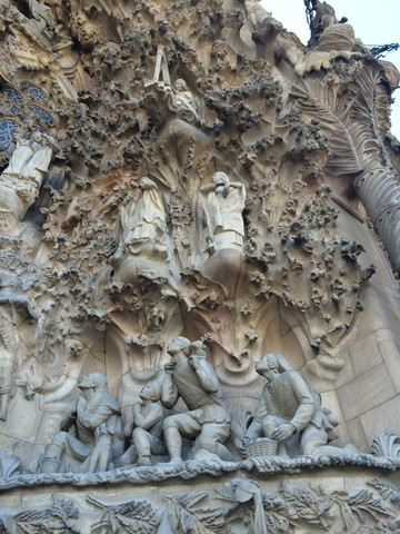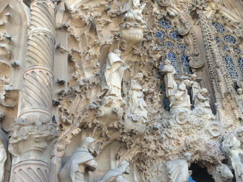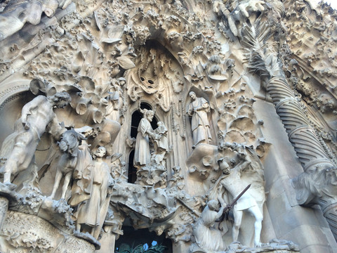 耶稣诞生立面:教堂有三个按圣经故事雕刻的立面,分别是已经完成的耶稣诞生立面、耶稣受难立面和还没完成的荣耀立面。这个立面是用完全写实的手法展现了耶稣的诞生,每一幅雕塑应该就是一个故事,同时整个立面上山脉洞穴遍布,也像一个天然的植物园,各种植物栩栩如生,万物因耶稣的诞生而喜气洋洋,和这些形成反差的是一个手中高举婴儿的士兵。