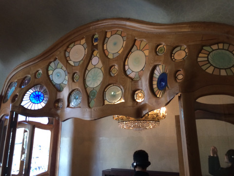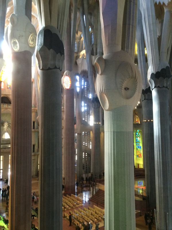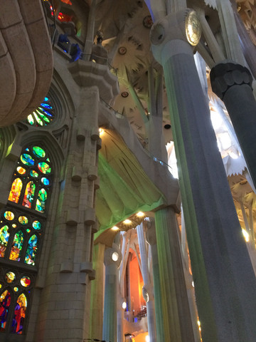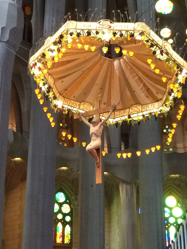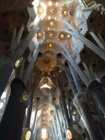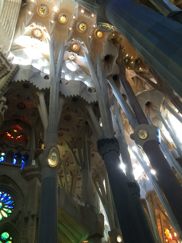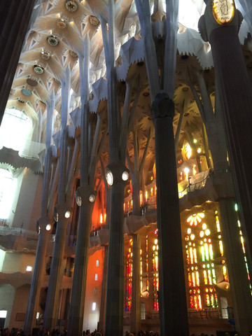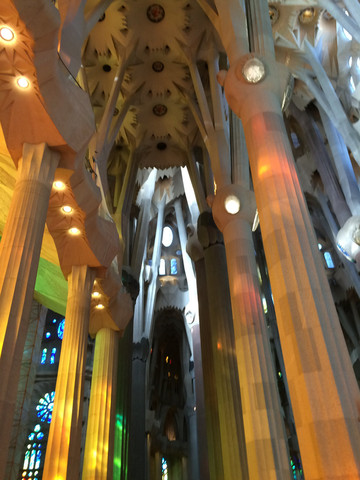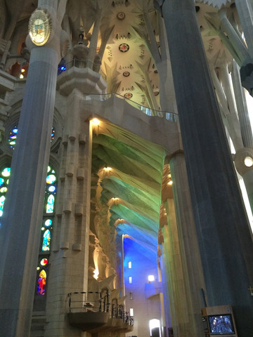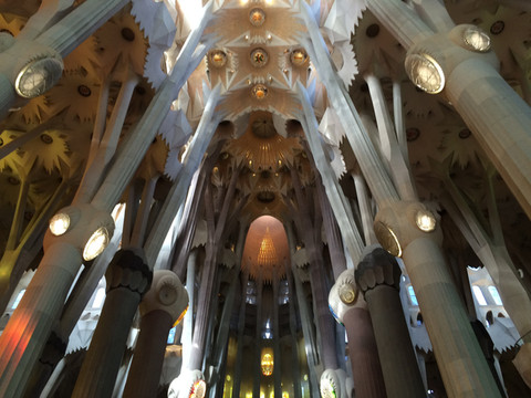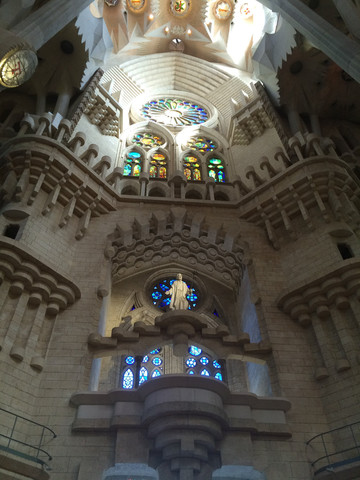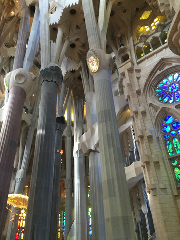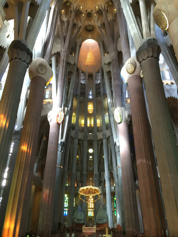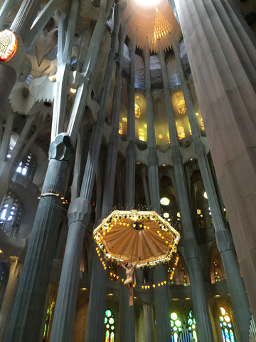 如梦如幻的教堂大殿是圣家堂的精华:进入教堂大殿,看到展示在眼前的画面,人人都会发自内心的惊叹:殿堂里几十根不同颜色的玄武岩、花岗石、大理石柱直上穹顶,每根石柱顶上圆弧穹顶互相支撑,极像枝叶繁茂的冲天大树,金色的阳光由穹顶之上照下,而通过墙面玻璃窗射入的光线则是五彩斑斓,值身其中就像是值身于上接天穹的浩瀚原始森林,甚至可以感觉到飞禽走兽和草木之声,身心超越时空与自然交融。殿堂之中耶稣像高悬在上,阳光从穹顶圆孔照下,形成一个天然光柱,把圣伞下的耶稣照亮,明暗之间,更显得肃穆真实凝重。在这里内心感觉到感应到的比看到的要多得多,这是一种超越艺术和宗教甚至超自然的神秘力量带来的震撼与感动。