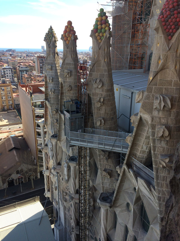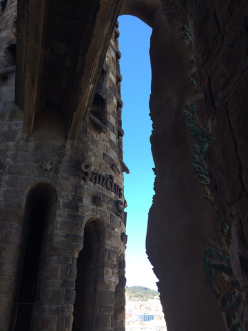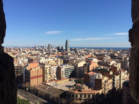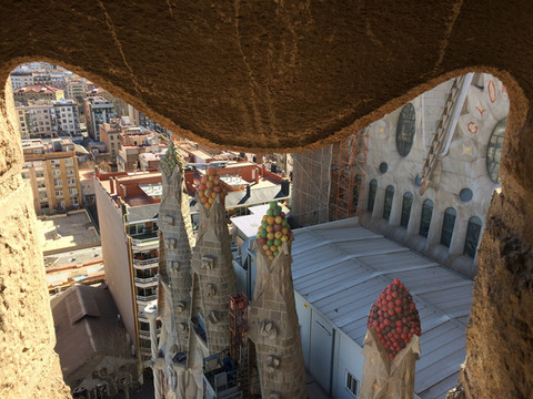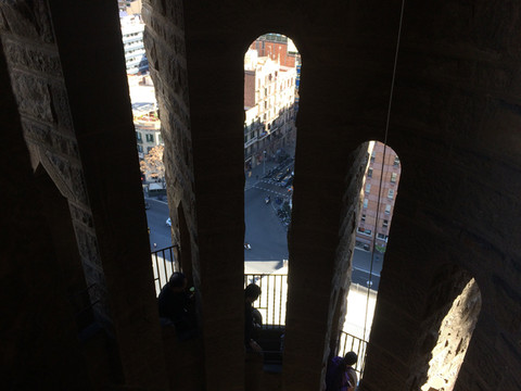 塔楼之景:在诞生立面旁乘电梯可以达塔楼中部,再沿狭窄的石梯盘旋,在小小的观景台和石窗可以看到巴塞罗那的城市景观,也可以近距离地感受高迪的建筑艺术。由于电梯一次只能搭乘几人,楼上通道也非常小,因此登塔楼是要限制人数的,需要单独购票,并预约时间排队登塔,最好是提前网上购票,同时也要预约租用中文讲解器。