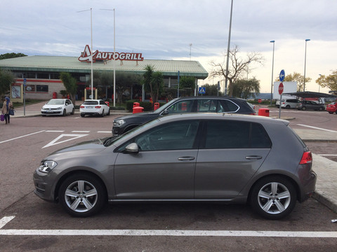 刚出机场不远,问题来了,仪表盘显示胎压报警,高尔夫居然有胎压显示,看来欧版配置还不错,赶紧打双闪在路边慢行,看到一个加油站马上拐进去停车检查,果然一个后轮已经全瘪了,高尔夫的备胎不是全尺寸的,换了也不能跑。商务人士马上联系救援,希望是开一个车来把这个车换回去或者是带一个轮胎来换,租车公司表示救援是外包的,处理流程是通知救援车来换轮胎,自己再开到停车场换车。于是只有等待,二十多分钟左右救援车到位,救援师傅经验丰富、手脚麻利很快换好备胎,换下的轮胎上赫然扎着一个铁钉,完工后救援师傅在手机屏幕上出示了一段英文,大概意思是车速控制,高速路不大于80km、一般道路不大于60km。回机场比较方便,导航仪里存有机场的经纬度坐标,调出即用,距离显示为距机场8km,只不过坐标定的是航站楼,多转了一圈才进入停车场。