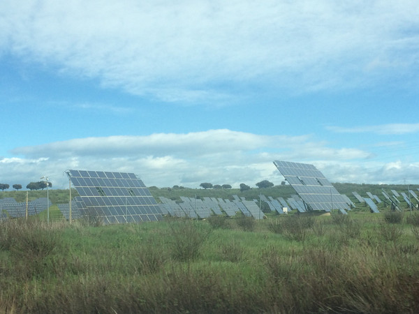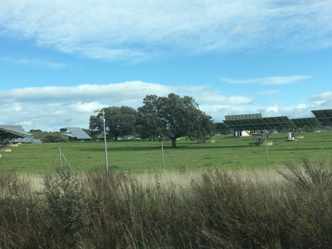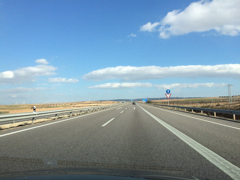 下午时分,车行穿过0度经线,我们又从西半球回到东半球,路边立有标识牌一闪而过,再入眼帘便是一排排的大风车。西班牙是一个十分重视环境保护的国家,给与清洁能源很高的补贴,大力发展风电和太阳能光伏电站,换来了极目尽是白云蓝天。
