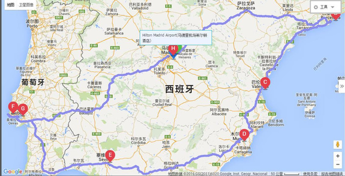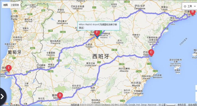 这次我们的安排是马德里机场取车后当天到巴塞罗那,在巴塞罗那住三晚玩两天,巴伦西住一晚,途经,塞维利亚住两晚,里斯本住两晚,马德里住三晚,其中托莱多一天。到西班牙后,觉得还是应该经格拉纳达到塞维利亚,路程远一百多公里,但可以参观更为著名的阿尔汉布拉宫,最终把住巴伦西亚调整为住木尔西亚达到了目的。