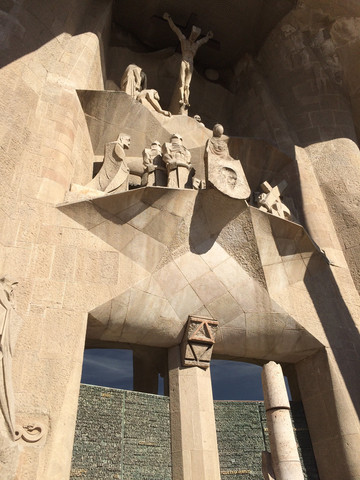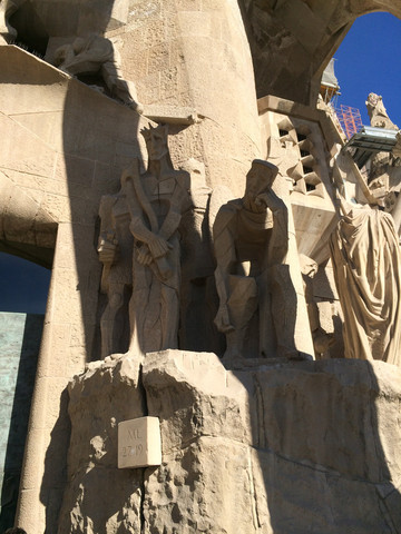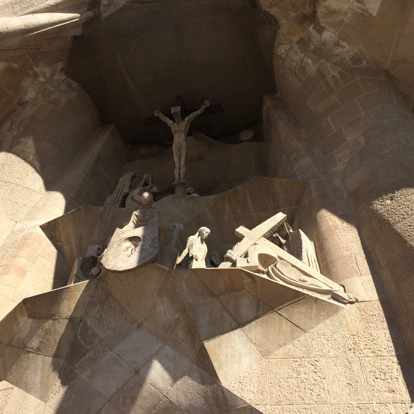 耶稣受难立面:大门外是耶稣被捆绑在石柱上的雕塑,表达耶稣出在苦难与折磨下所产生的悲痛。这个立面的雕塑冷峻、抽象、棱角分明,和高迪的其他作品迥然不同,也许这个题材的确不再适合曲线,或许是高迪新的探索,虽然这个立面的雕塑是在高迪去世几十年后才完成,但据解说器讲,这是完全按照他最初的设计实施。整个立面是一个整体,表现了耶稣受难的这一事件,十多幅独立的雕塑又分别表现这个过程的不同时点。从立面左下方耶稣与十二门徒最后的晚餐开始,雕塑组呈之字型盘旋而上,最顶端是耶稣在十字架上蒙难;其中可以看到:耶稣被骑马持剑的罗马军人、步行的士兵逮捕,耶稣在罗马法庭被判决,背负沉重的十字架蹒跚前行等画面。