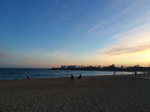 海边掠影:从巴塞罗那港到,十里海岸、船坞沙滩,游人在清风中陶醉,海鸥在阳光碧波下翱翔。