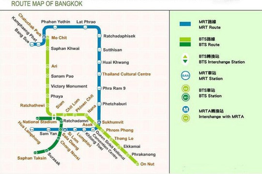 目前有两条BTS线路:深绿色的是隆线(Silom Line)和浅绿色的素坤逸线(Sukhumvit Line),两条线在Siam站内换乘