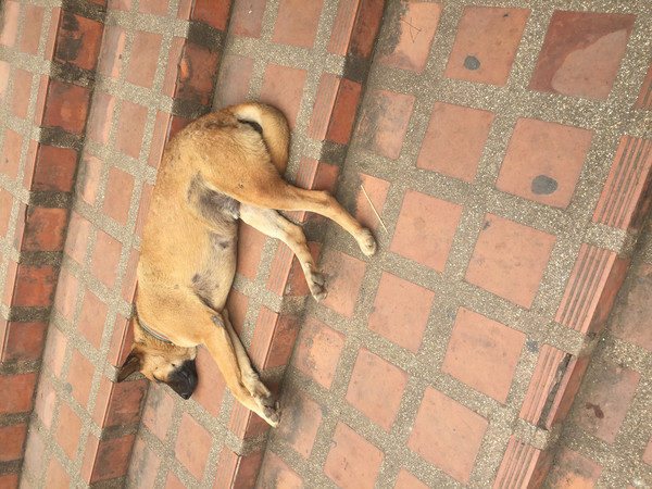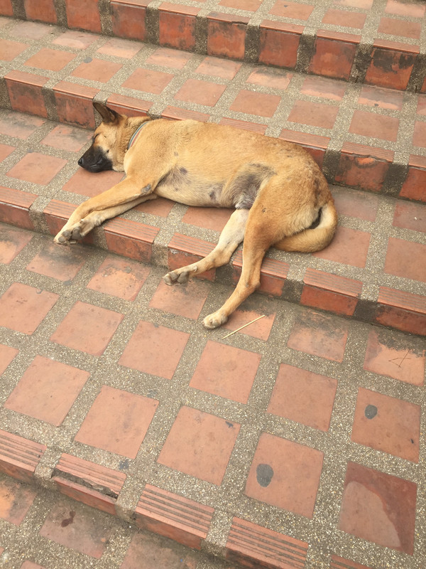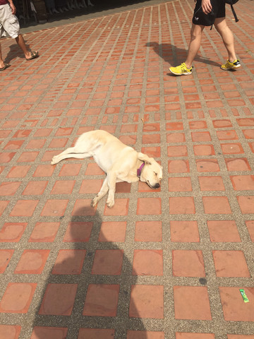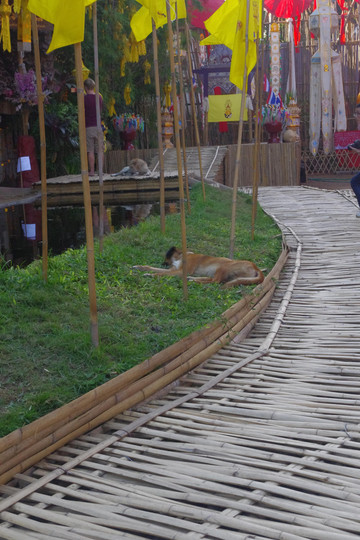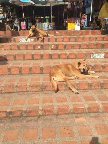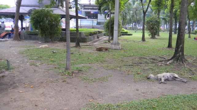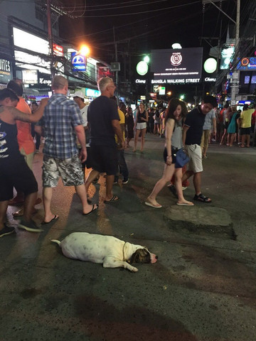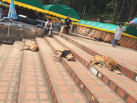 在泰国生活的狗狗简直是太幸福了,基本上到每个景点都会看到狗狗和猫咪,它们根本不怕游人,特享受的躺在那里,睡起觉来怎么吵闹都不醒,游人也不怕它们,它们四处遛达,好像再多的人也与它们无关。每条都长得肥肥的,泰国人很喜欢狗狗和猫猫,而且人家也没有吃狗肉这一说,在想想我们天朝,,啧啧啧。。
