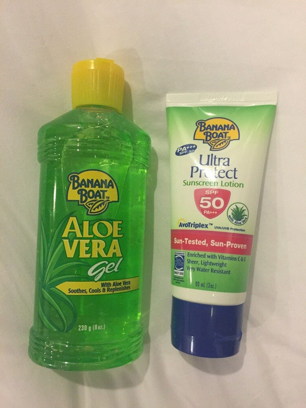 50+的防晒,绿色大瓶子的是芦荟晒后修复,因为全程一直擦这两个,回家后没有黑太多。