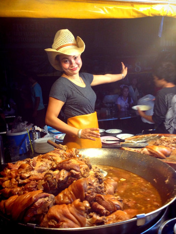 美女老板娘天天戴着牛仔帽,晚上才慢悠悠的出摊,大概在四点半左右,小摊位置在清迈北城门昌卜克夜市,很好找,哪家人多就是啦~一盘美味的猪脚饭只要30泰株,猪脚炖的肥而不腻,汤汁稀而不淡,真心美味。猪脚饭除了猪肉还搭配了酸菜和一颗半熟蛋,坐下吃还可以喝那的矿泉水会给冰块,一瓶10株。