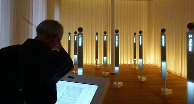 想过把指挥家的隐吗?这里可以满足你。每个音箱代表一个声部,音箱上面的摄像头可以捕捉你的动作,你可以通过动作控制每个声部的音乐表情。不要乱指挥哦,音箱们会罢工,然后就没声音了。