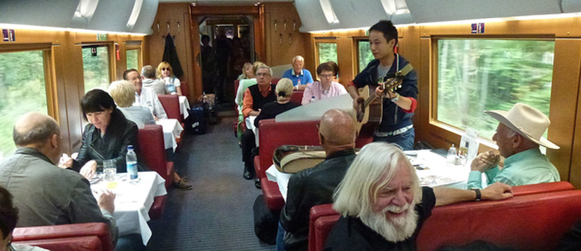 这一趟旅程相当长,在餐车里,有人看到我们有乐器,就起哄让我们表演。我们问了列车员,这里能否表演,他说你要问我,我是不能允许你们表演的,但是你可以不要问我。我们没想过会在这里挣钱,注意照片第一排的这位长得像耶稣的老人,他拿着碟子走出来帮我们一个座位一个座位的收钱,哈哈。