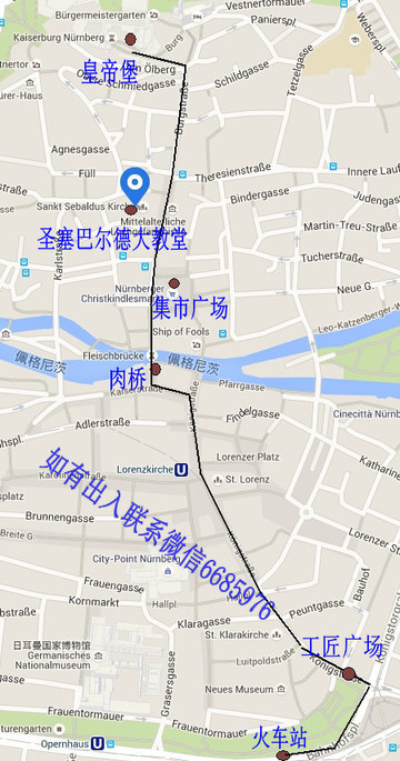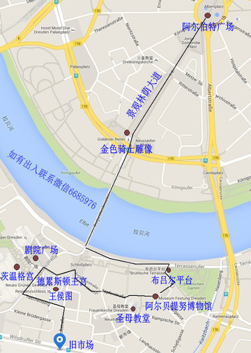 步行示意图,这个城市拉贝河北边是新城,南面是旧城。