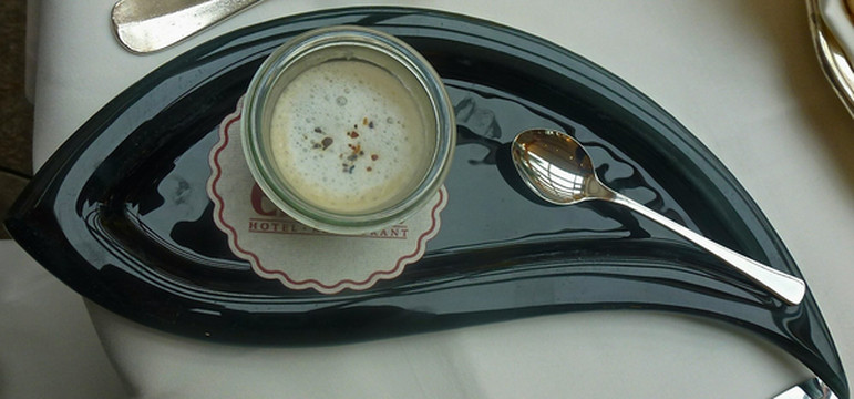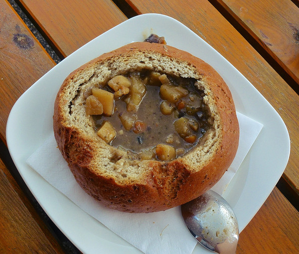 终点吃了点东西,这里就介绍一个Suppebrot (汤面包),德国风格的面包韧而脆,越嚼越香。你们看这个面包中间挖空,做份汤放进去,把汤喝完,里面相对软的地方充分吸收了汤的味道,加上外面的脆皮,也许是我太饿了还是怎么的,吃得太过瘾了。