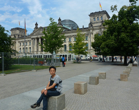 国会大厦前面的广场上,我看着我的瑞士朋友,指向瑞士驻德国大使馆