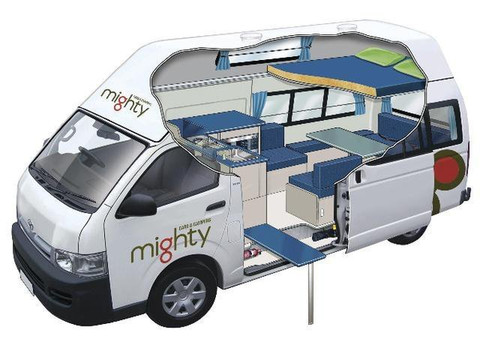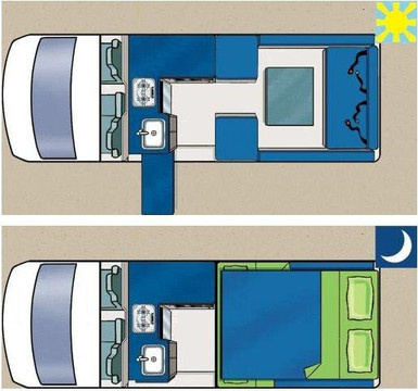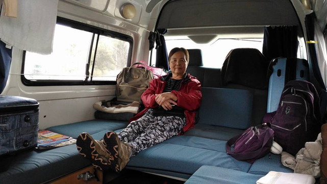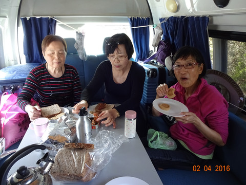 這輛可容四人的露營車,其實車內空間狹小,白天乘坐沒問題,晚上睡覺就有點侷促。特別是上舖較狹窄,高度更是僅可轉身,不能抬頭,更不用談坐起,爬進去都困難。或許一般家庭使用,讓身裁尚小的孩子睡上鋪較合適。我們四個成人,而且都是老人,行動不夠靈活,確實有點為難了。
