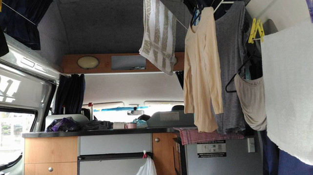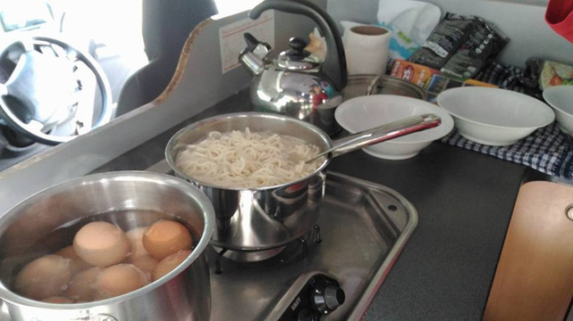 露營車上生活用具齊全(車上還有Wifi),只是沒有衛生間(大型車才有)。有瓦斯炉、微波炉、水箱、洗滌槽、許多抽屜、裡面碗、盤、碟、杯、刀叉各有四份,還有水壶、水盆、砧板、菜刀、晒衣繩、夾子……,四人各有床單、睡袋、枕頭及大毛巾;還有一張野餐桌和四張帆布摺疊椅,生活用品一應俱全,可謂設想周到。