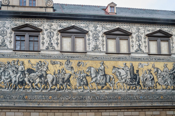 其实我最想亲眼目睹的是皇宫城堡里的绿宫(Historical/New Green Vault),其中珍宝无数,但十分另类的居然周二闭馆——也就是说这次无缘得见了。跟好几个工作人员确认过也还郁闷了好一会儿,喝一杯热巧克力我们该去茨温格宫(Zwinger)。沿途先看到的是101米的瓷砖画,描述的是萨克森王国的王侯们。