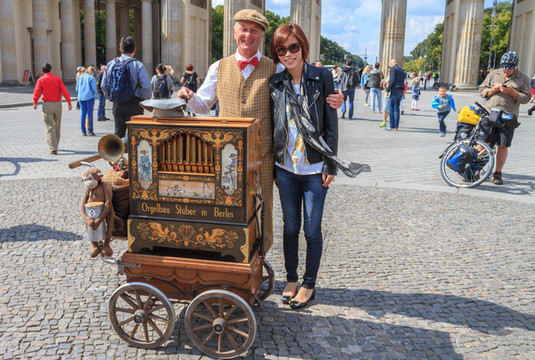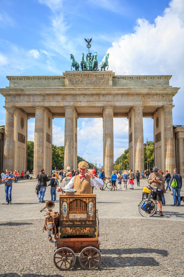 终于来到勃兰登堡(S1 S2 S25 U55, Brandenburger Tor)门前,虽然战后这里被隔离起来(因为靠着柏林墙),但现在都是平和的景象,到处都是累得不行的游客。只有这位摇着音乐盒营造欢乐的气氛。