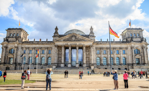当当当,国会大厦(Reichstag Building)终于出现。这栋建筑原来是普鲁士的宫殿,两德统一后才被重新用作国会建筑。顶部的玻璃穹顶是开放参观的,只需预订不需门票(http://www.bundestag.de/htdocs_e/visits/kuppel/kupp/245686),不过我们去的时候是暑假旺季,必须提前1-2天才能预定到,所以,没上楼。