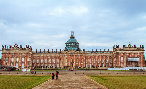 前面灰黄色的建筑是波茨坦大学的财产,它掩护的是便是红色的巴洛克风格宫殿——新宫(Neues Palais)。听名字也可以推断,这里建造得比无忧宫其他部分要晚。其实是无忧宫的建造者——普鲁士国王腓特烈二世在“七年战争”结束之后为了彰显国力而建,这段回廊用来遮挡外侧的沼泽地,两侧的房屋则是厨房、杂物间,供仆人和园丁们出入,但依然优美有余。
