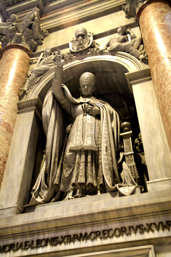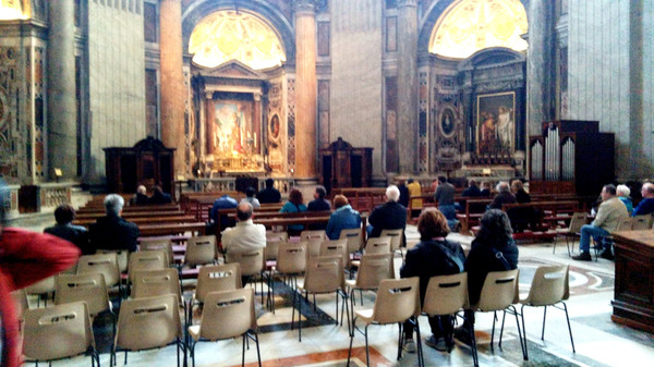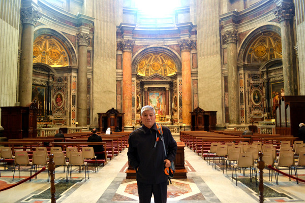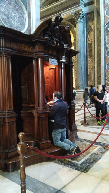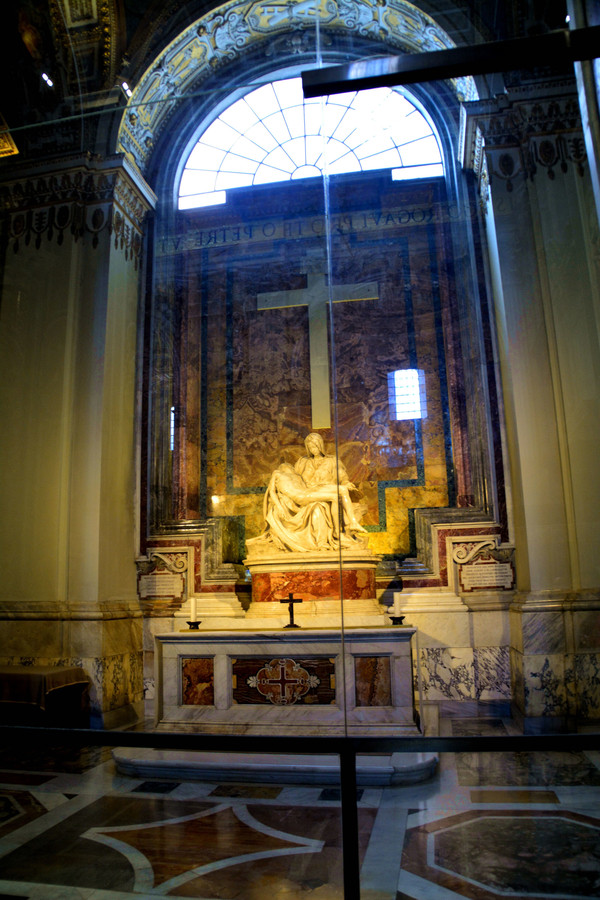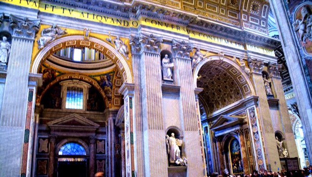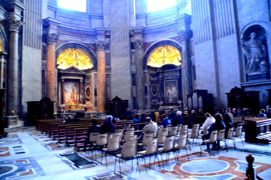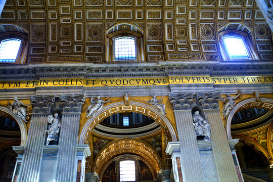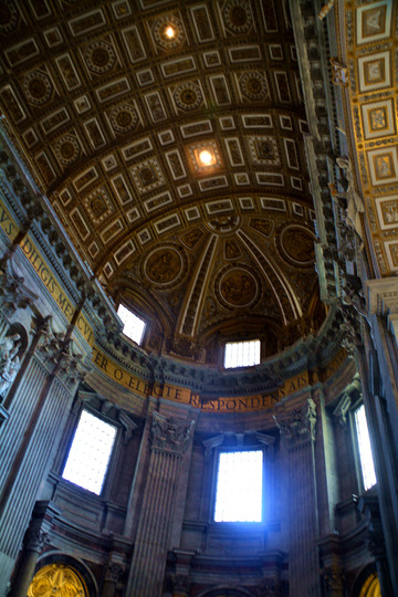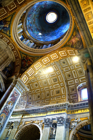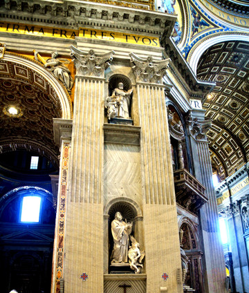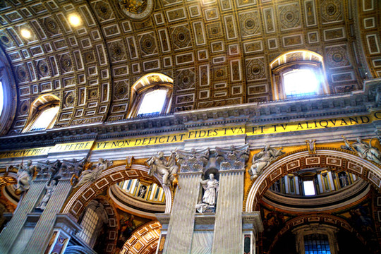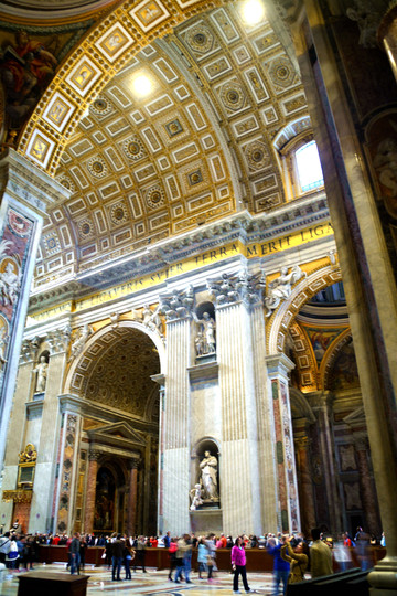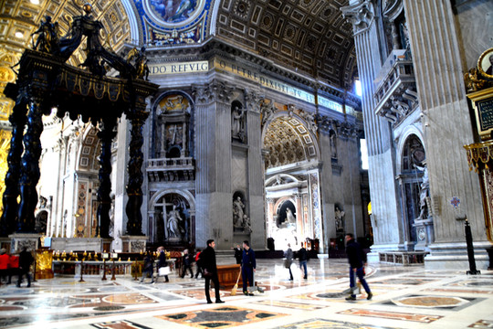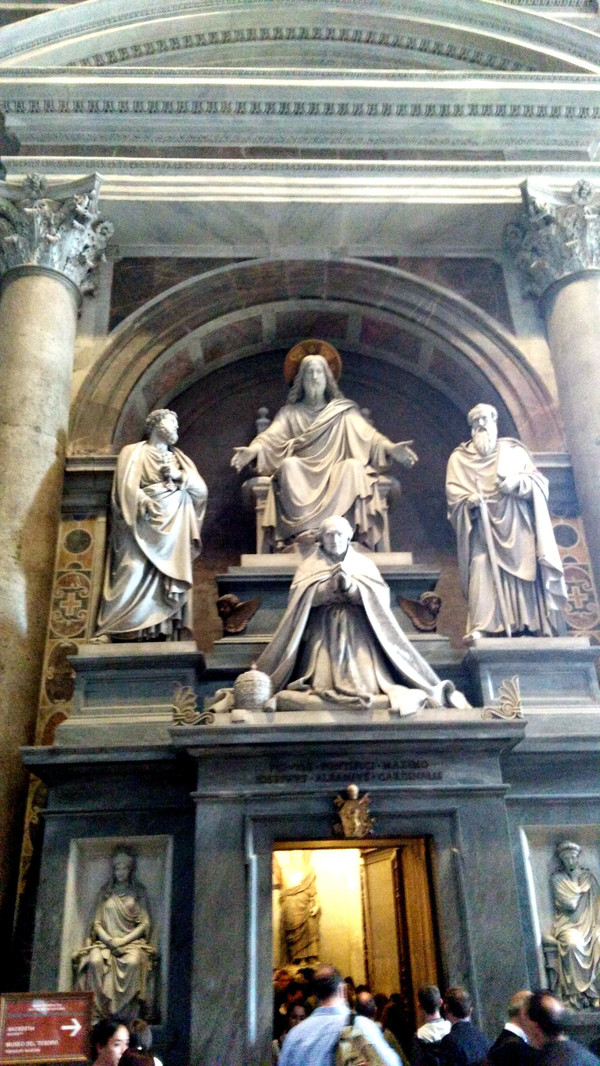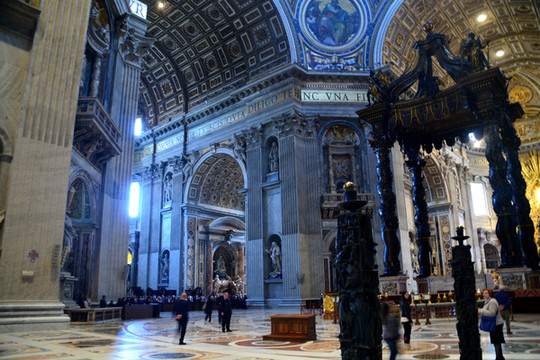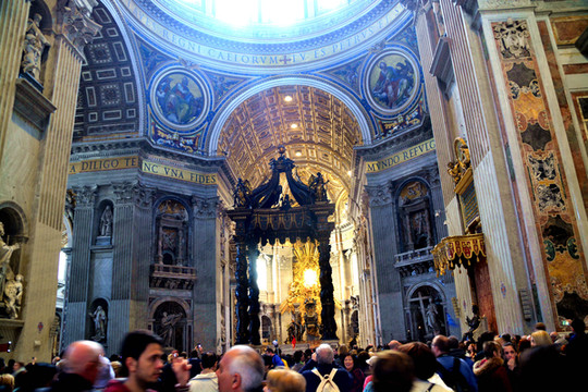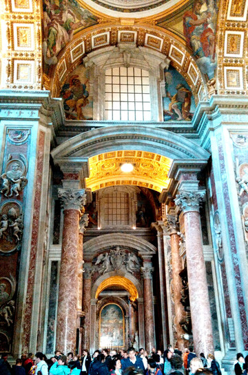 终于我们走进了圣彼得大教堂。在大教堂前面及广场一圈伫立着多根石柱,每根顶上都有一尊雕像。教堂入口处有五扇大门,从右至左分别为圣门、圣事门、中门、善恶门、死门,每扇大门上都刻有圣经人物或故事的浮雕画。圣门每隔25年的圣诞之夜才会打开,上一次还是2000年。而游客一般从中门进入,幸运的话在周日可以见到为大众祈福的教皇。