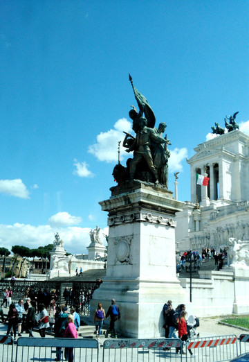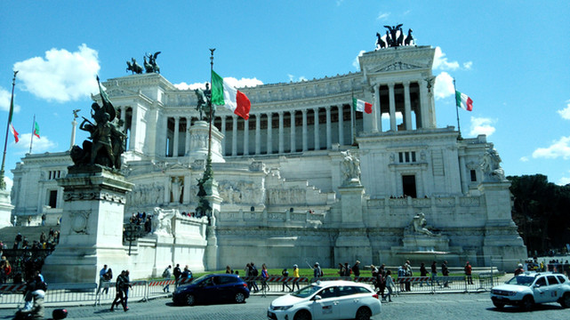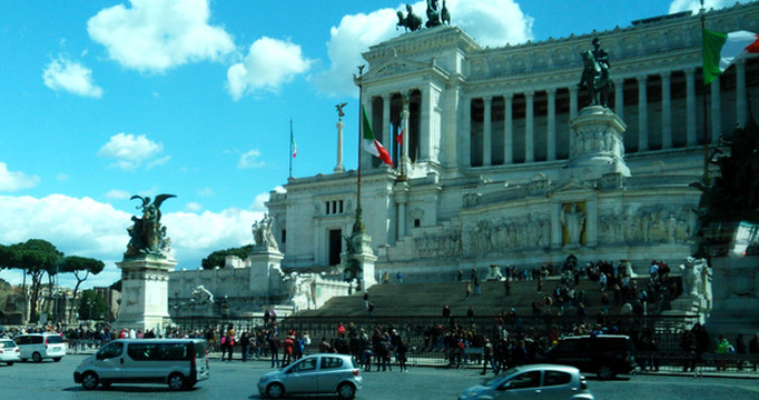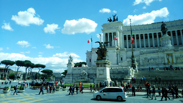 广场上有不少人。如今它是无名士兵坟墓的所在地,这就意味着你不可以坐在纪念馆的任何一个位置,因为有两位目光锐利士兵在守卫,有点类似中国的人民英雄纪念碑。如果想要拍摄它的全景,则通常要后退到马路的对面才可以,因为它的体积实在太大。纪念堂的顶部可以俯瞰熙来攘往的威尼斯广场,也是整座城市为数不多能够俯瞰全景的地方。登顶后,正面是现代罗马城的全景,背面是古罗马遗址,穿越感很强。