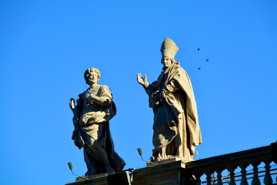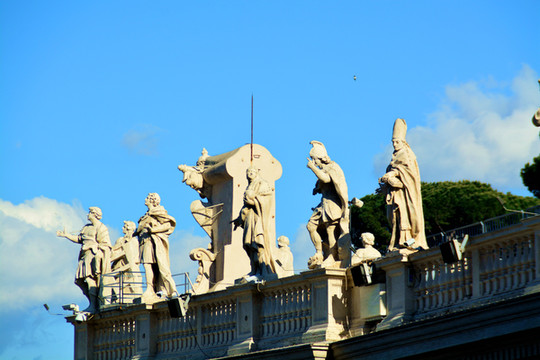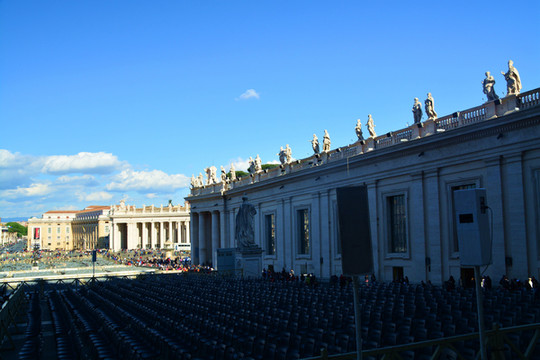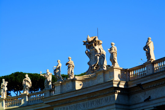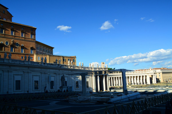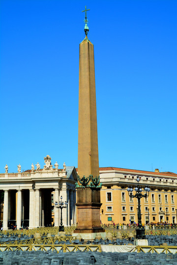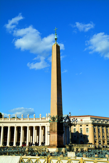 广场的柱廊上有140多座雕塑,都是由贝尼尼和他的学生一起完成的,雕塑全部都是宗教人士。广场的中央是卡里古拉从古希腊赫利奥波利斯带回罗马的方尖碑,有说法称这座方尖碑的顶部铜球中是凯撒的骨骸。看着夕阳西下的大广场,漂亮。