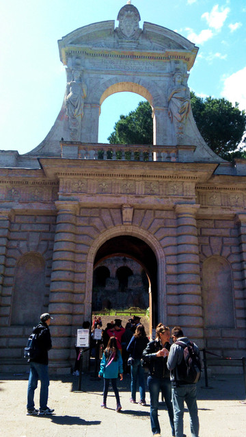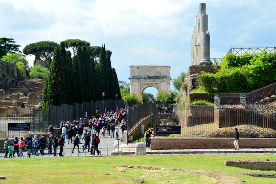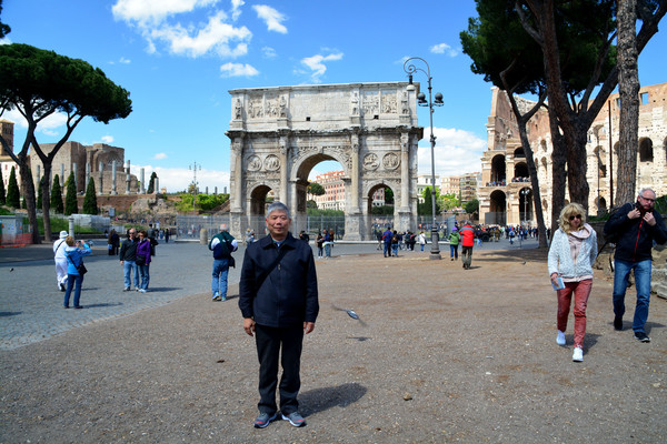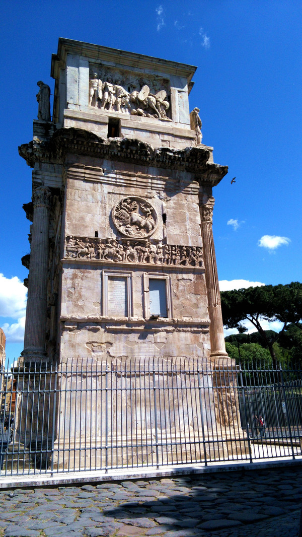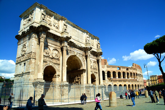 现在君士坦丁凯旋门的四周都被铁栅栏围了起来,游客只能在外部拍照留念。站在凯旋门左前方的空地上可以将凯旋门和斗兽场一起拍摄进去。当年拿破仑来到罗马,见到了这座凯旋门,大为赞赏,之后以此为蓝本,打造了巴黎凯旋门。所以君士坦丁凯旋门虽然是罗马三座凯旋门中建造最晚的一座,但仍然可以看出早期罗马艺术的影子,而且保存比较完好,值得一看。我们去参观的时间,对于喜欢拍照的人来说不是最好。最好的时间是黎明和傍晚,尤其是傍晚,夕阳西下,太阳光从侧面过来,拍出的照片非常好看。