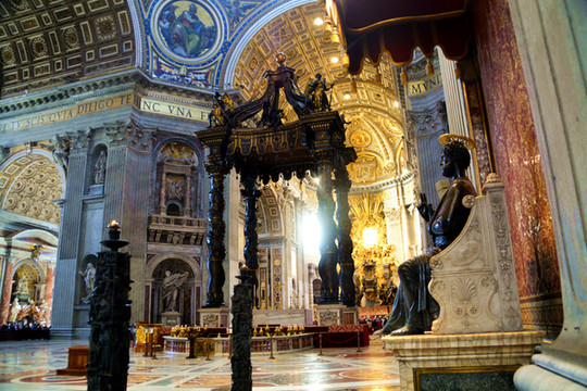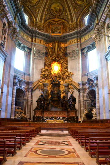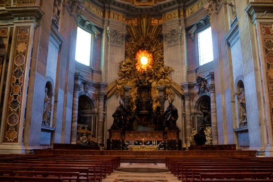 正殿的最里边则是圣彼得宝座,由一把宽大的镀铜木椅和金光四射的巨大青铜雕塑群组成。椅背上是两个小天使,手持开启天国的钥匙和教皇三重冠。而宝座上方有许多小天使围绕着光芒四射的太阳图案,这是一块镶着鸽子的圆形彩色玻璃,透射着阳光。
