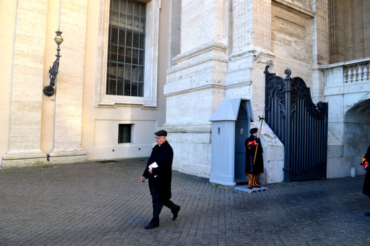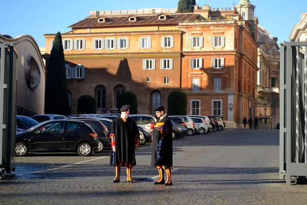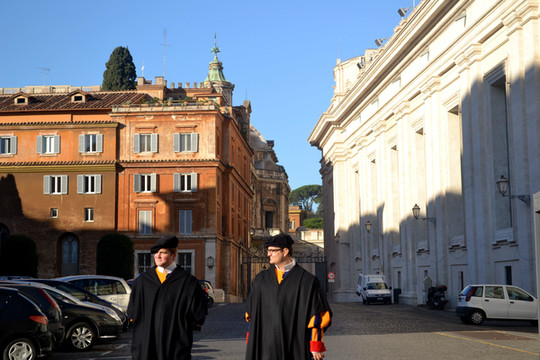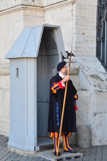 梵蒂冈瑞士卫队是梵蒂冈的国防力量,英俊潇洒的卫兵们每天身着橙蓝相间的制服,在圣彼得教堂旁站岗,也是一道亮丽的风景线。