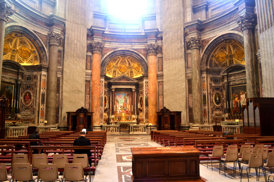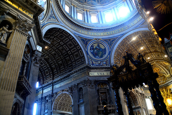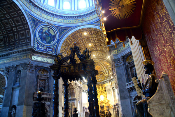 中央的圆顶是由米开朗基罗设计的,两重结构,内部很明亮。圆顶下是教皇的祭坛,用贝尼尼创作的青铜华盖覆盖着。那扭曲的粗圆柱似的独特形状很引人注目。下面的礼拜堂里有圣伯多禄墓。墓前跪着的是由新古典主义雕刻家卡诺巴作的教皇庀奥六世像。里面上部有彩色玻璃作的鸽子,下面装饰着贝尼尼作的巨大的“圣伯多禄的椅子”,面前的左边有珍宝馆的入口,那些豪华的圣器皿类显示着梵蒂冈的力量。