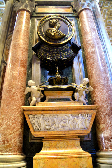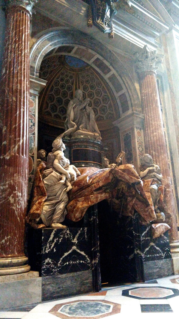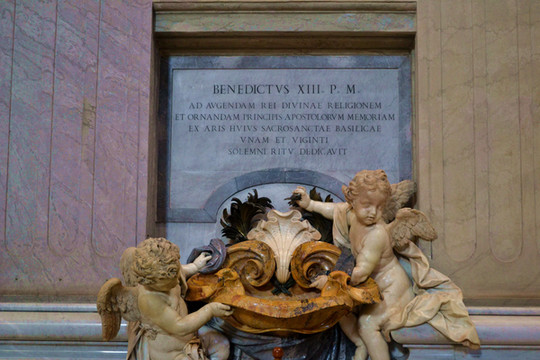 大殿内有很多巨大的雕像和浮雕,大殿的左右两边是一个接一个的小的殿堂,每个小殿内都装饰着壁画、浮雕和雕像,最著名的是米开朗琪罗的圣母哀痛雕像和一座圣彼得的青铜塑像。我最喜欢的是刚走进大门处的两个小天使捧圣水缸的雕塑,从形象上看小天使只有一岁的样子,然而雕像的实际高度有2.5米。众多的统治者、勇士、殉难者的雕像给人们留下了太多的威严、冷峻和痛苦的记忆后,再看到这天真可爱的小天使时,一种安慰、一种美好的感觉油然而生。艺术家把小天使和圣水放在一起,是因为那时的人们视水为上帝赐予人的圣洁之物,水是生命之源。