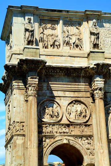 位于斗兽场西侧的君士坦丁凯旋门,长25.7米,宽7.4米,高21米,拥有3个拱门,其上的雕塑精美绝伦、恢宏大气,千年逝去,已是残迹斑斑,却仍在风雨中,与古罗马斗兽场共同见证罗马的辉煌。如今的凯旋门成为了游客来罗马必看的一个景点。凯旋门上方的八块浮雕板是当时从奥理略皇帝纪念碑上拆卸而来,现在原件已被珍藏在罗马首都博物馆。主要内容为历代皇帝的生平业绩,如安东尼、哈德良等。而每根圆柱顶端的达基亚囚犯大理石雕像则很可能来自图拉真广场。只有两个小拱门上方的圆形浮雕描绘了这场战争的场面。