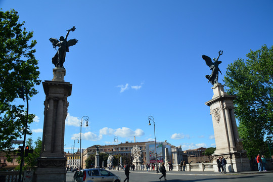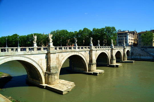 圣天使桥也称圣彼得桥,是一座古罗马桥梁,跨台伯河,公元134年由罗马皇帝哈德良兴建,连接市中心与圣天使城堡。这座桥表面用大理石铺砌,有三个桥拱,仅供行人步行。在6世纪,教宗额我略一世将城堡和此桥都以“圣天使”命名,传说天使长弥额尔在城堡的屋顶显现,宣布黑死病的结束。在1450年的禧年,由于大量朝圣者的到来,许多人落在河里淹死,故拆除了桥头的房屋以及一个罗马凯旋门,以便拓宽朝圣的通道。圣天使桥可以说是罗马城中最美的桥梁,桥上有十二尊惟妙惟肖的天使雕像,每个天使手上都拿着一样耶稣受刑的刑具。其中二尊天使出自意大利著名的雕刻家兼建筑师贝尔尼尼之手的雕塑真品已经被收藏于Santa Adrea delle Fratte教堂,两座复制品于桥上。