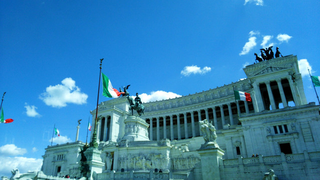 威尼斯广场上最引人注目,也是地标性建筑的就是被当地人称为“结婚蛋糕”或者“打字机”的,为纪念意大利的统一以及促成其统一的埃曼努埃尔二世而建,几乎就坐落在罗马城的几何中心,通体是一座白色大理石建筑。