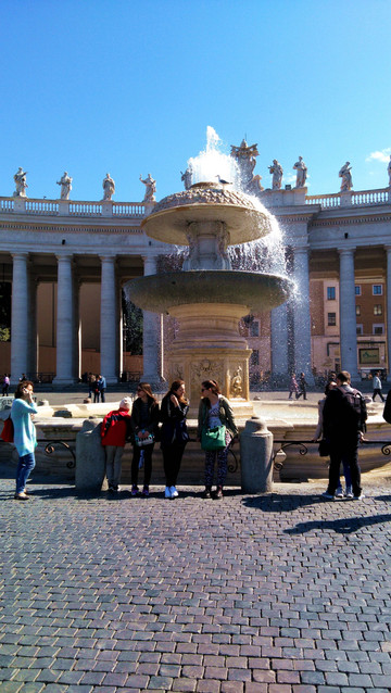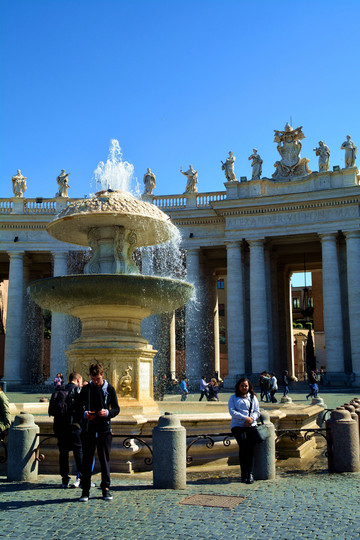 广场两侧有两座喷泉,右边是玛德尔诺17世纪时修的,左侧的是贝尔尼尼设计、后来修的复制品。站在圆柱与喷泉之间的白色大理石上看长廊里的圆柱,最不可思议的是4根圆柱看上去好像只有1根,贝尼尼的伟大造诣从这里也可见一斑!
