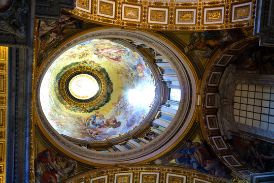 教堂内部装饰华丽,我们见到的教堂中央著名大拱形屋顶是米开朗基罗的杰作,双重构造,外暗内明。对于这个大圆顶,曾有过百年的波折,最先是布拉曼特于1506年设计,1514年他去世后拉斐尔接替了他。六年后,拉斐尔也去世了,教会对教堂顶部借鉴哥德式的设计,强调黑暗与光明的对比,采用了玫瑰花窗,于是出于对教堂入口处的光线对比效应的考虑,圆顶被取消。后来米开朗基罗在71岁高龄时接替了这项工作,以“对上帝、对圣母、对圣彼得的爱”的名义,恢复了圆顶。圆顶廊檐上有十一个雕像,耶稣基督的雕像位于中间,廊檐两侧各有一座钟,右边的是格林威治时间,左边的是罗马时间。