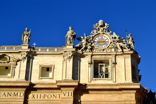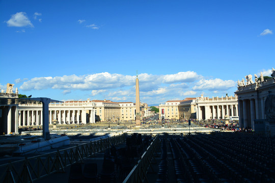圣彼得广场位于梵蒂冈的最东面,集中各个时代的建筑精华,如果搭乘教堂的电梯来到顶部,俯瞰罗马全城,整个广场就如一枚钥匙,分别由四排多立克式圆柱形成的两个半圆形的柱廊组成一个巨大的椭圆,弧形地包围住整个广场而后延伸向大教堂,在贝尼尼看来,这样的设计代表教堂的双臂张开,拥抱整个世界。