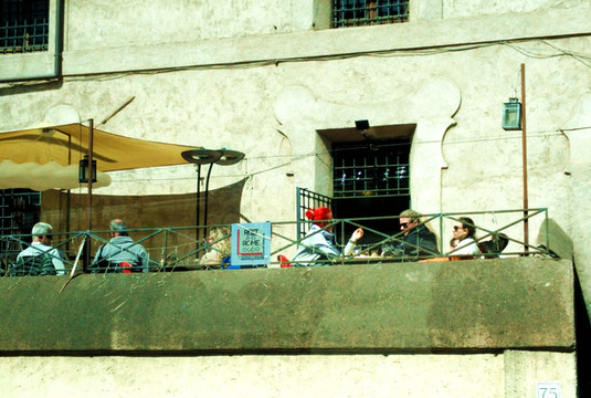 一处民居,简易露天的咖啡馆。一位红红的红毛女郎格外耀眼。