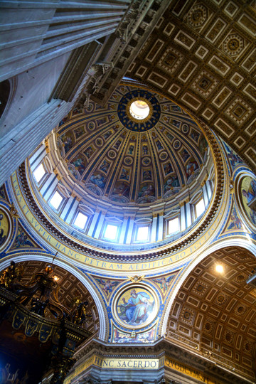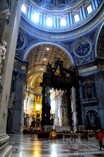 大教堂不仅宏伟巨大,而且是见证著名的建筑和雕塑大师贝尼尼艺术天赋的纪念碑。教堂内部宏伟、幽深,正中是贝尼尼设计的高达29米的巴洛克式华盖。教皇祭坛往上119米高处是米开朗基罗的设计代表作:中央圆顶。搭乘电梯后,还需要爬一段,才能到达顶部,俯瞰钥匙形状的圣彼得广场和罗马全城。