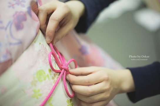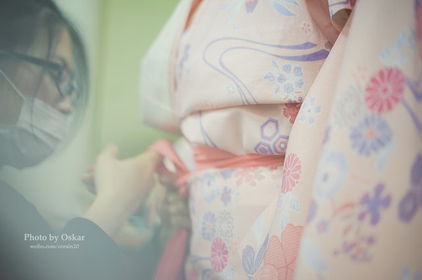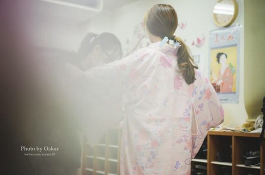 挑选完自己喜欢的和服款式,就要开始穿咯。工作人员的手法相当熟练,而且创衣服的效率真的相当高。原来觉得穿和服会是一件很麻烦的事,没想到很快就穿好了。