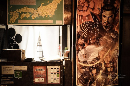 居酒屋的氛围营造的相当不错哦,非常复古的装饰,还会有各类战国主题相关的小物件。