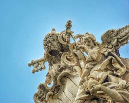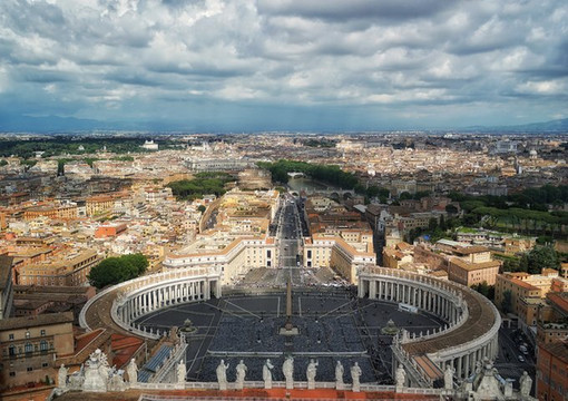 梵蒂冈参观完毕就从入口旁边出来,绕过一段城墙就到了圣彼得大教堂,进入教堂需要排队过安检,参观不收费,如果登顶需要付费,乘电梯7欧好像和走楼梯4欧吧,体力不行还是电梯吧,仍然需要爬一段楼梯,教堂顶并不宽敞,可以俯瞰整个罗马城,再就是那个“通往天堂的钥匙”造型,登顶必拍!