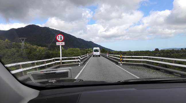 (6) 南岛所到之处所谓的高速公路其实也就是双车道,遇到桥梁,桥上只有一个车道,只能按照提示等待一方通过后再通行。