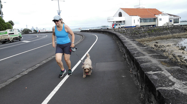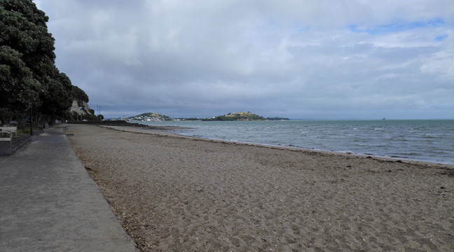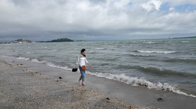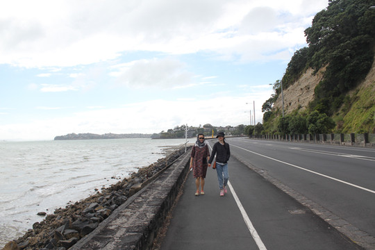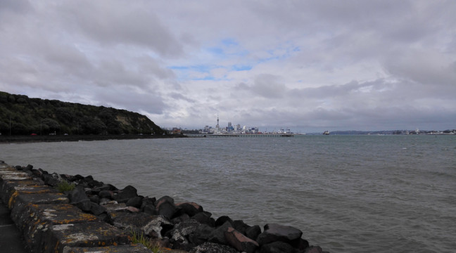 隐约可以看到奥克兰的(Skey Tower)。顺着海边的步行道,回宾馆。