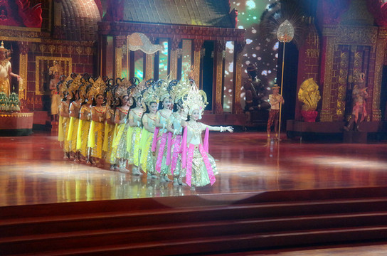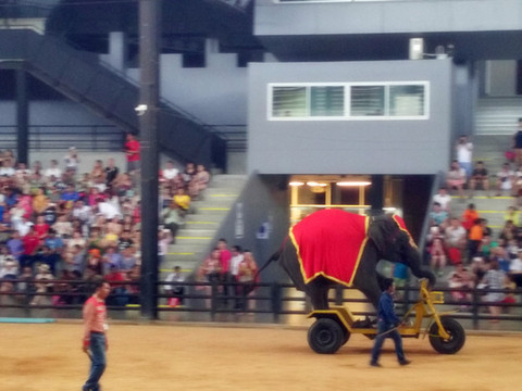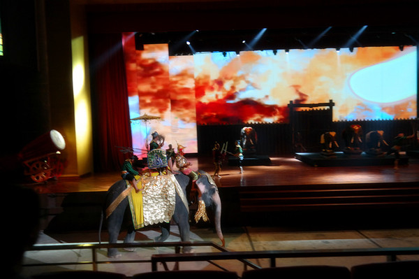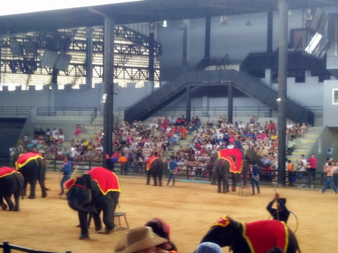 从游览车上下来就可以去剧场看表演了,这个表演分为两个部分,一个是在室内看泰国民俗表演,舞台效果确实不错,挺漂亮的,另一个是在剧场在大象表演,小朋友可能更喜欢大象表演,不过真的挺有意思的,大象会投篮、画画、骑自行车、踢球、跳舞......卖萌的时候确实挺可爱!