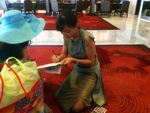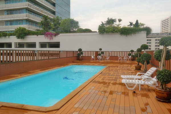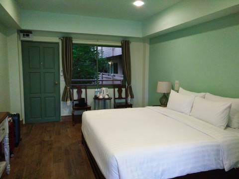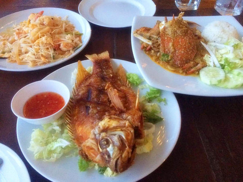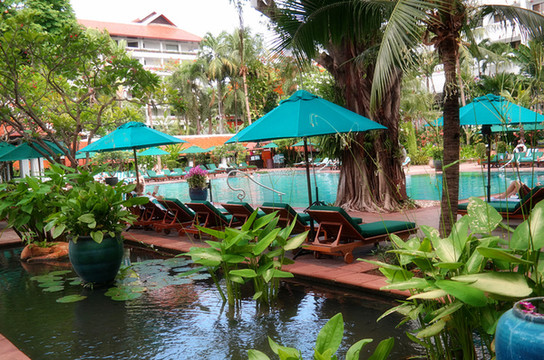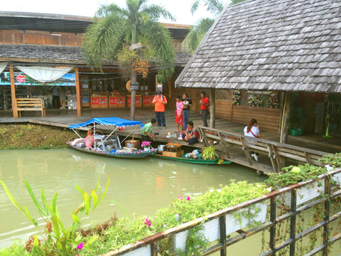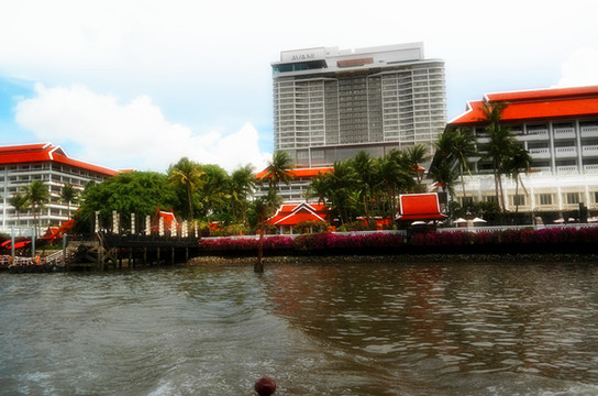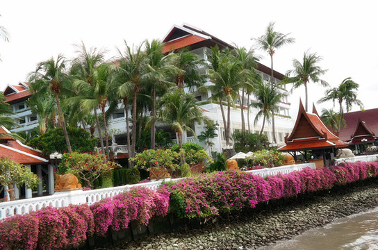 然后就是去曼谷了,本来可以包个车过去,费用估计在1000B以上,结果老公非要说咱们体验一下生活吧,然后就做了个小摩托到这边的汽车站,从汽车站坐了两个小时的车到曼谷,刚好遇上曼谷的堵车时间(不过曼谷真心堵啊,市中心经常是每天都堵着),所以就只能坐天铁远离市中心,在天铁站下车之后再打了个车到酒店。在天铁站遇到一个极好的泰国警察,不仅主动上来询问帮忙,还帮我们把酒店的名字翻译成泰文给司机看,非常热心。一番折腾之后终于到了酒店,这个酒店叫安纳塔拉河畔度假酒店,是一个五星级酒店,全程英文交流,不带早餐的普通是500多人民币,如果要住这家酒店,还是建议定700多的带双早的房间,因为据说这家酒店的早餐是5星级酒店里最好吃的(之一吧)。环境确实很好,有漂亮的游泳池、spa馆、健身馆......酒店还会免费给你一部手机使用,可以打电话、上网,最关键还有曼谷精品旅游景点的介绍,酒店就在边,对面就是号称亚洲最大的水上市场—河畔市场。酒店会有免费的接驳船,每半个小时一班,到河畔市场和沙吞码头,末班船是晚上十二点。河畔市场也有很多免费的接驳船到沙吞码头,交通比较方便。到了酒店之后就坐船去了对面的河畔市场,随便逛逛吃了顿泰国餐。