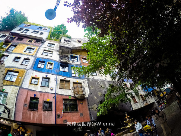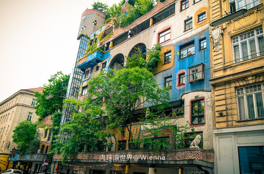 百水公寓的的外墙面上大块大块鲜艳的颜色拼在一起,整个建筑都看不到一个直线,窗户也是形状各异。平台和阳台上都种满了植物,充满生机。目前公寓中的住客大多是艺术家,但因是私人住宅,内部并不开放。